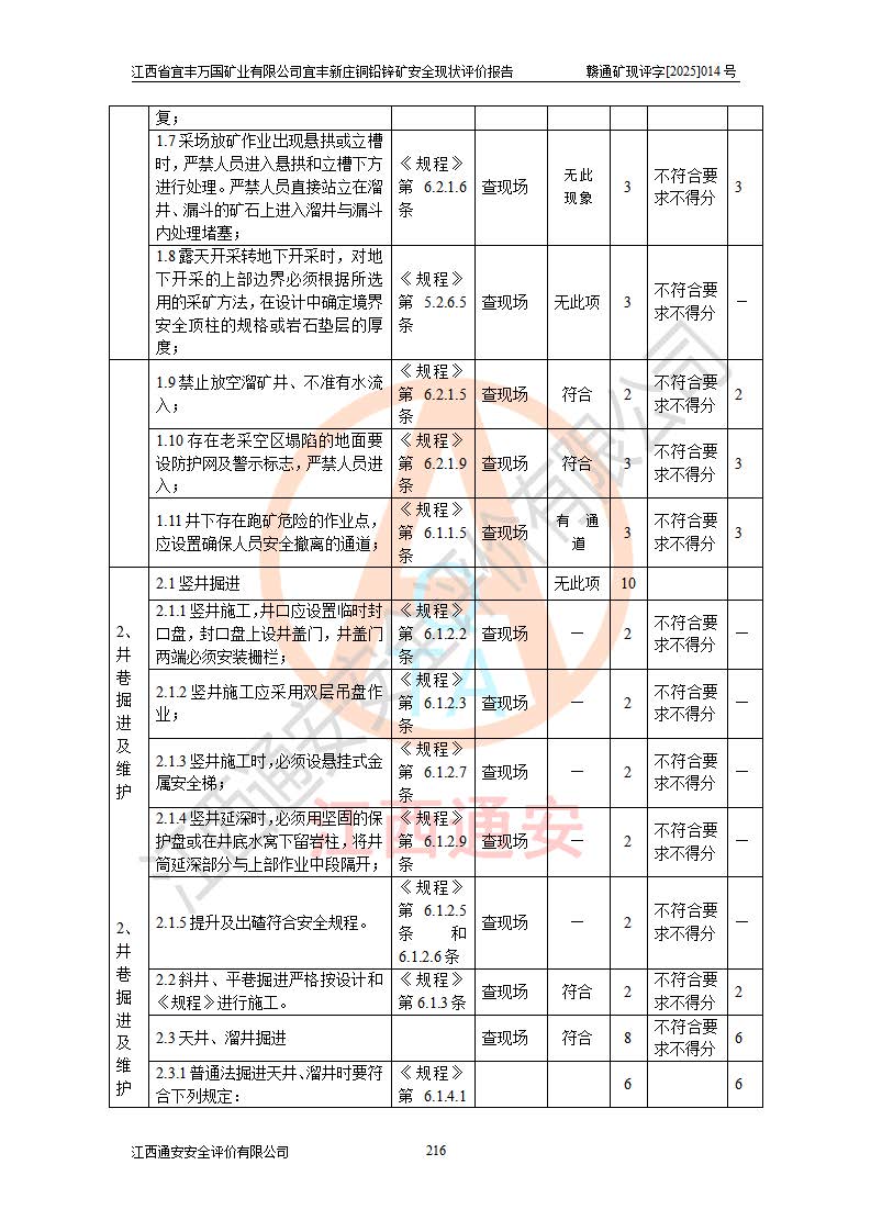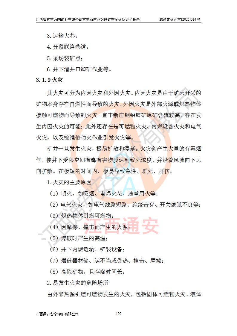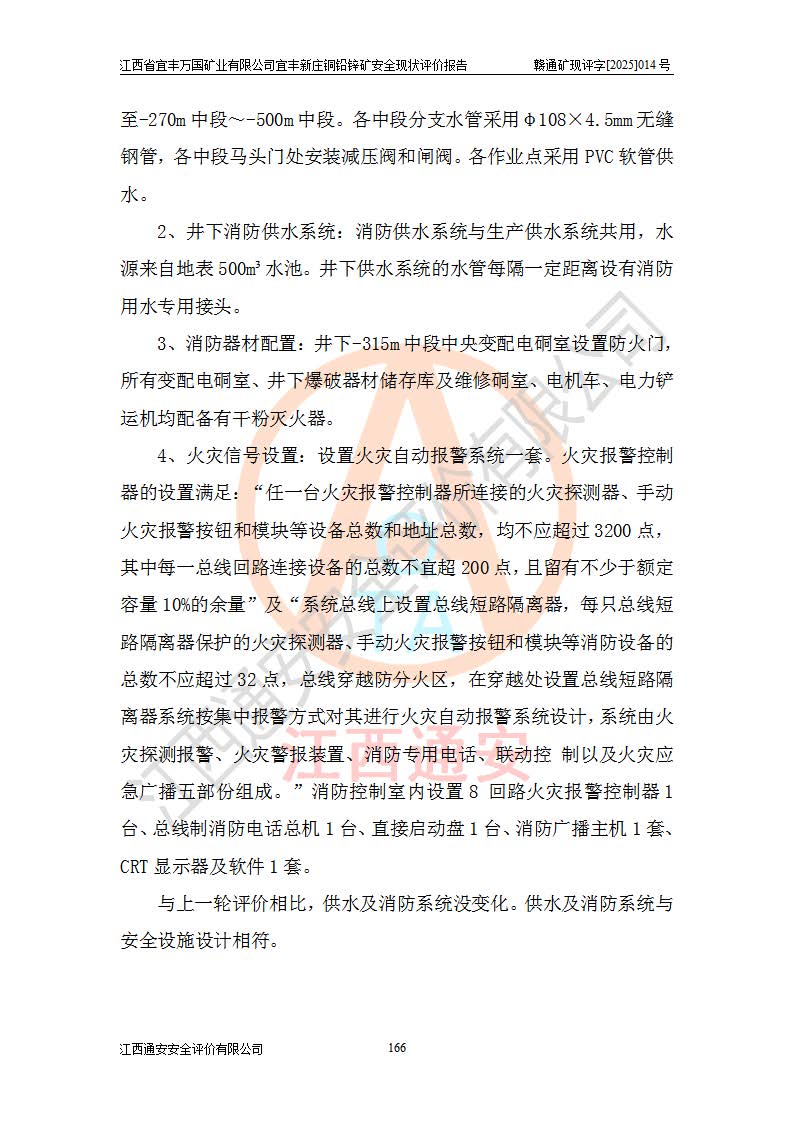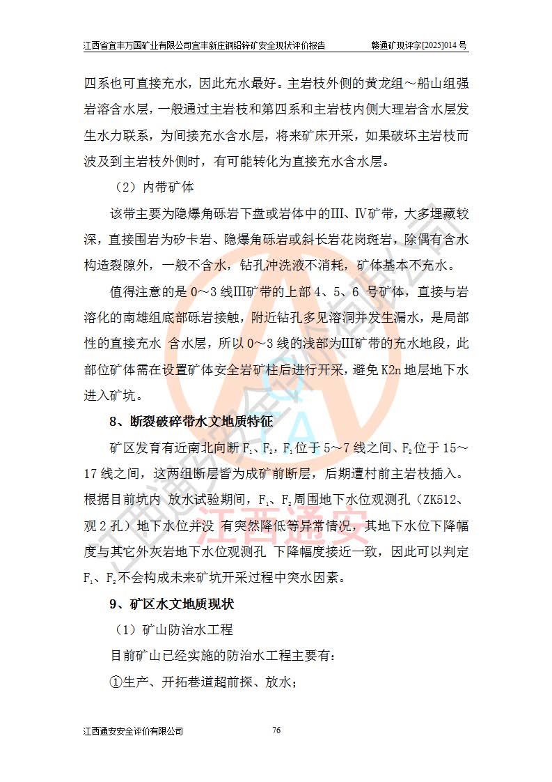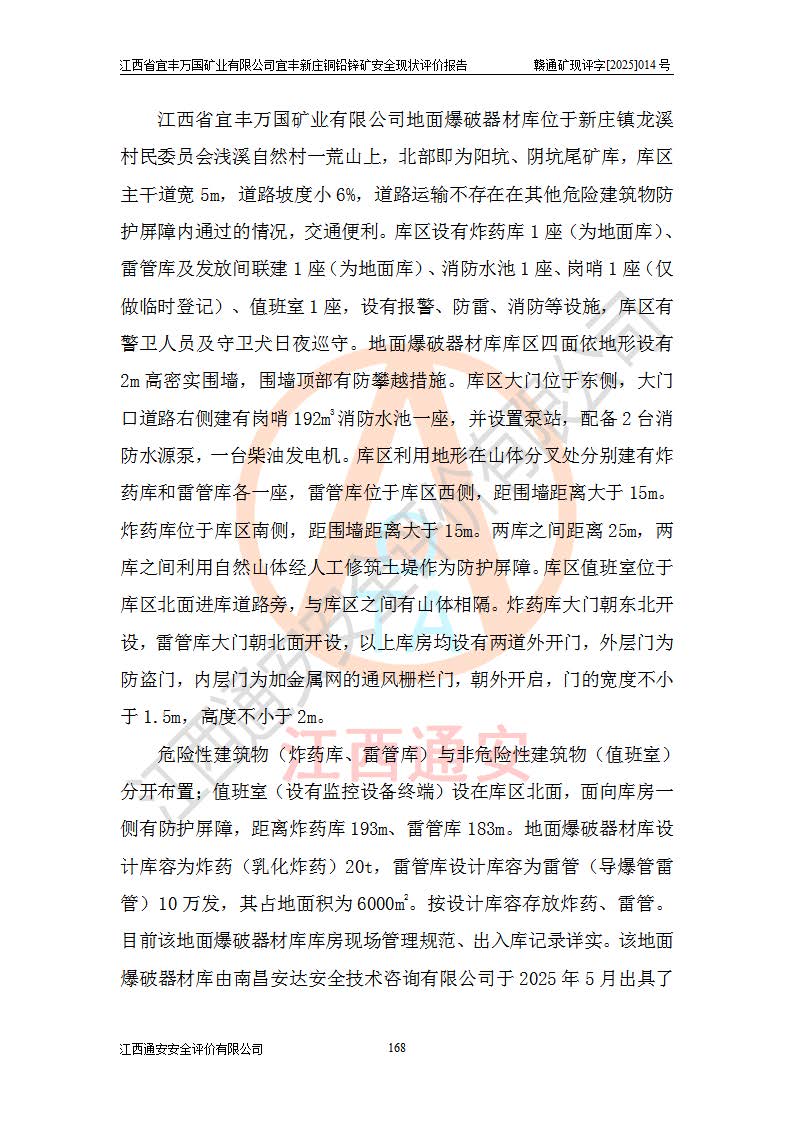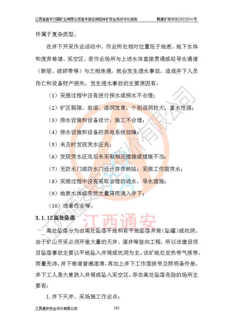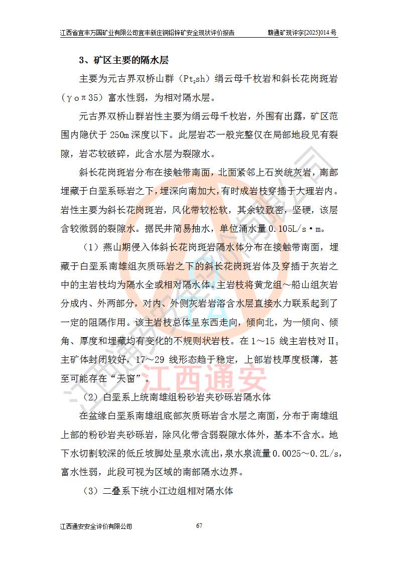 其它 | 江西省宜丰万国矿业有限公司宜丰新庄铜铅锌矿地下开采的主要生产及辅助系统:提升运输、排水、供配电、通风、供风、采掘、安全避险“六大系统”等符合法律法规要求和规程、规范要求;各种危险有害因素及不可接受的风险在运行中认真落实行之**的技术措施或管理措施,严格按规程,按要求加强管理,可以避免和控制各类事故,**安全生产。现阶段矿山设备、设施和场所符合**安全生产有关法律、法规、标准及规范的规定。矿山采用竖井开拓方式,安全生产条件较好;安全管理能满足法规要求,矿山现状与安全设施设计一致,矿山地下开采符合**规定的安全生产条件。 |