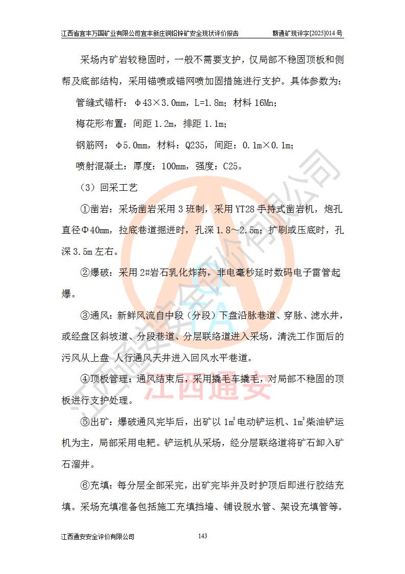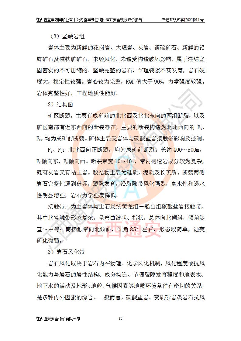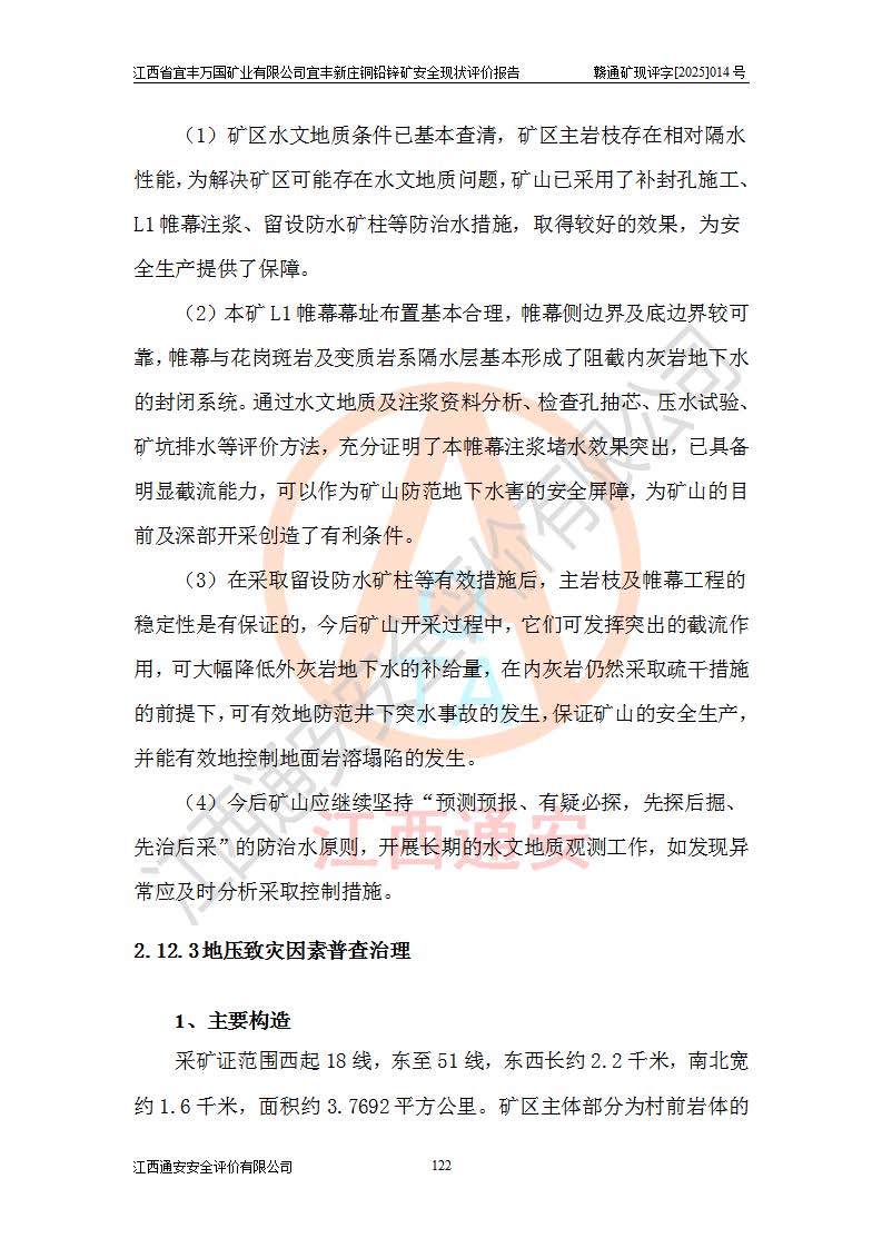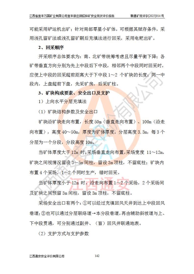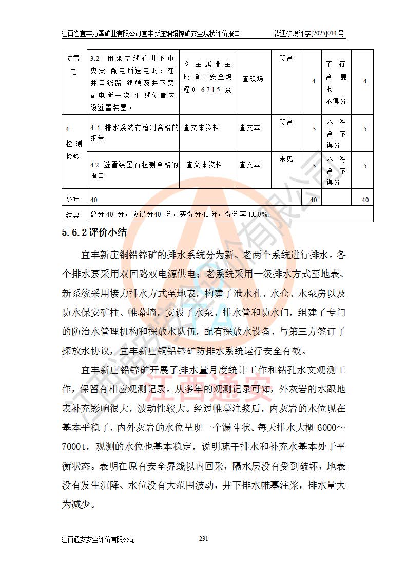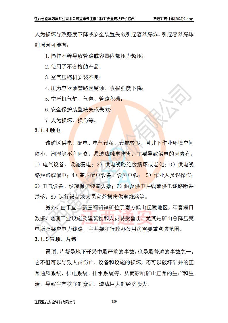 其它 | 江西省宜丰万国矿业有限公司宜丰新庄铜铅锌矿地下开采的主要生产及辅助系统:提升运输、排水、供配电、通风、供风、采掘、安全避险“六大系统”等符合法律法规要求和规程、规范要求;各种危险有害因素及不可接受的风险在运行中认真落实行之**的技术措施或管理措施,严格按规程,按要求加强管理,可以避免和控制各类事故,**安全生产。现阶段矿山设备、设施和场所符合**安全生产有关法律、法规、标准及规范的规定。矿山采用竖井开拓方式,安全生产条件较好;安全管理能满足法规要求,矿山现状与安全设施设计一致,矿山地下开采符合**规定的安全生产条件。 |
