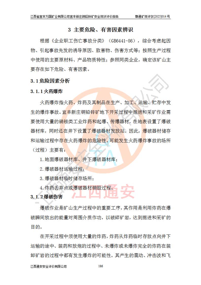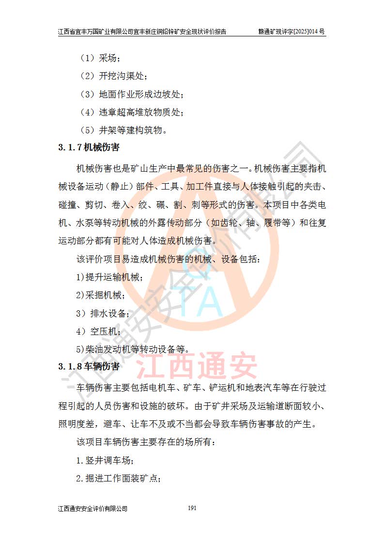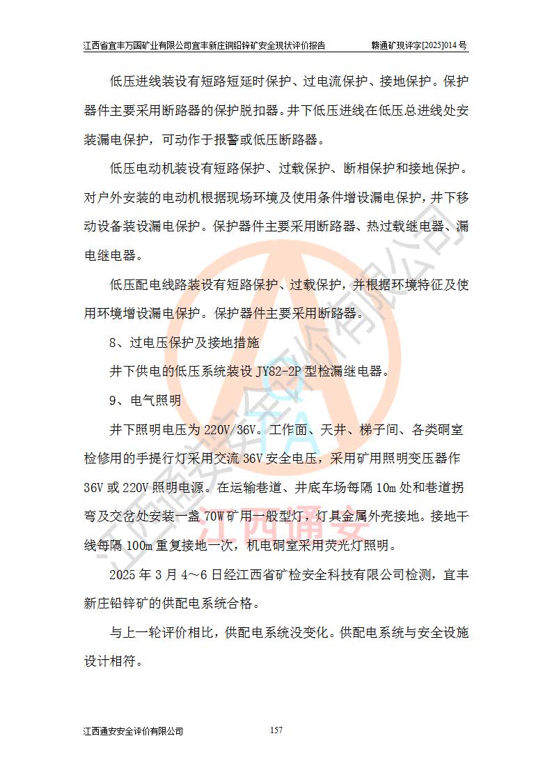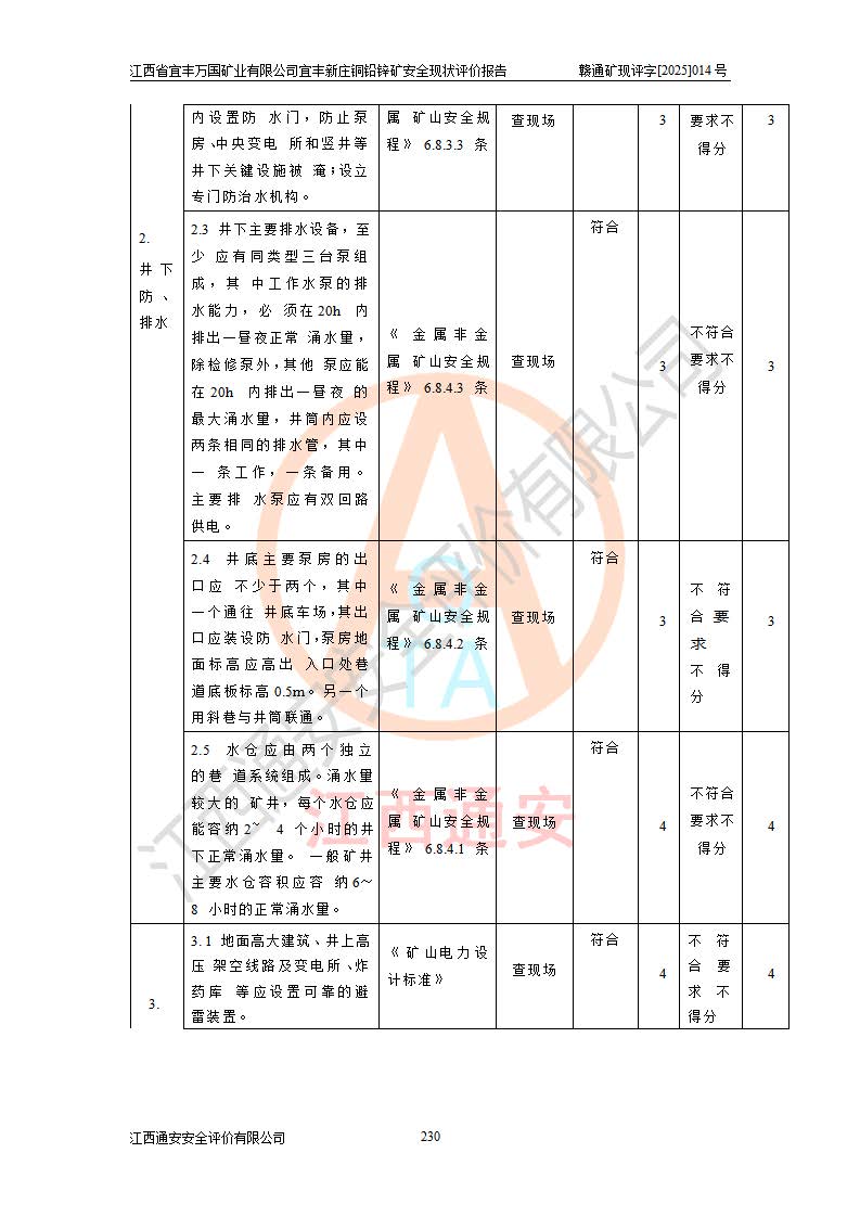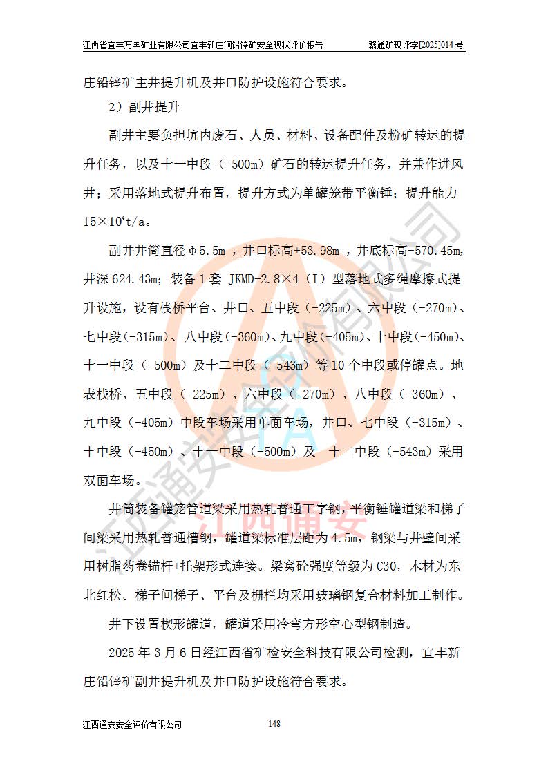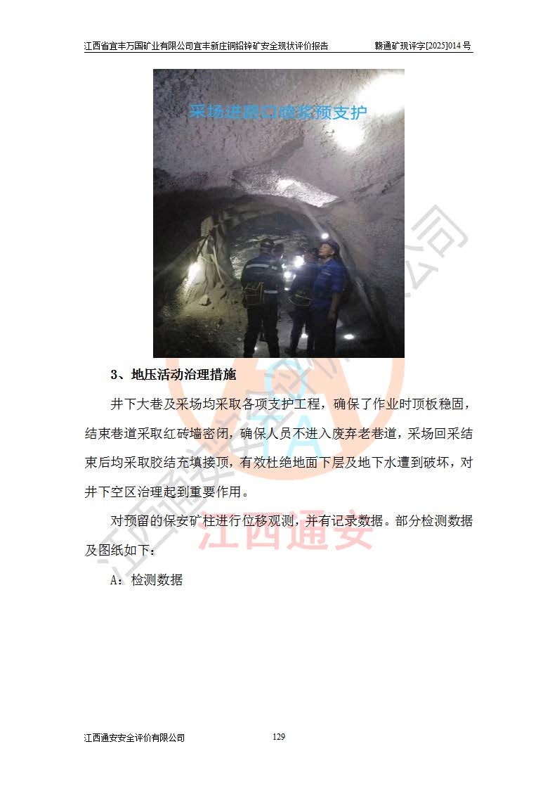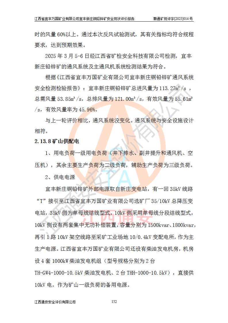 其它 | 江西省宜丰万国矿业有限公司宜丰新庄铜铅锌矿地下开采的主要生产及辅助系统:提升运输、排水、供配电、通风、供风、采掘、安全避险“六大系统”等符合法律法规要求和规程、规范要求;各种危险有害因素及不可接受的风险在运行中认真落实行之**的技术措施或管理措施,严格按规程,按要求加强管理,可以避免和控制各类事故,**安全生产。现阶段矿山设备、设施和场所符合**安全生产有关法律、法规、标准及规范的规定。矿山采用竖井开拓方式,安全生产条件较好;安全管理能满足法规要求,矿山现状与安全设施设计一致,矿山地下开采符合**规定的安全生产条件。 |