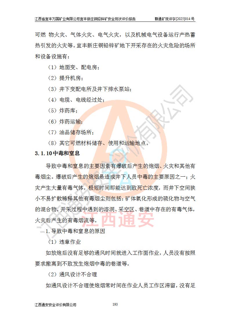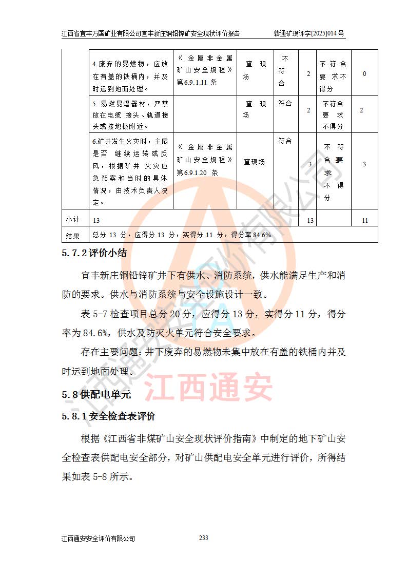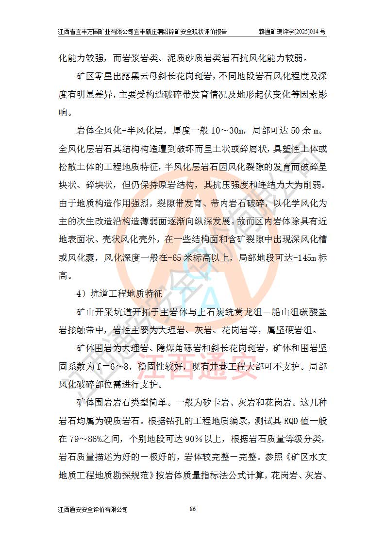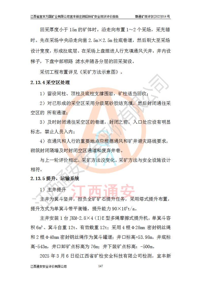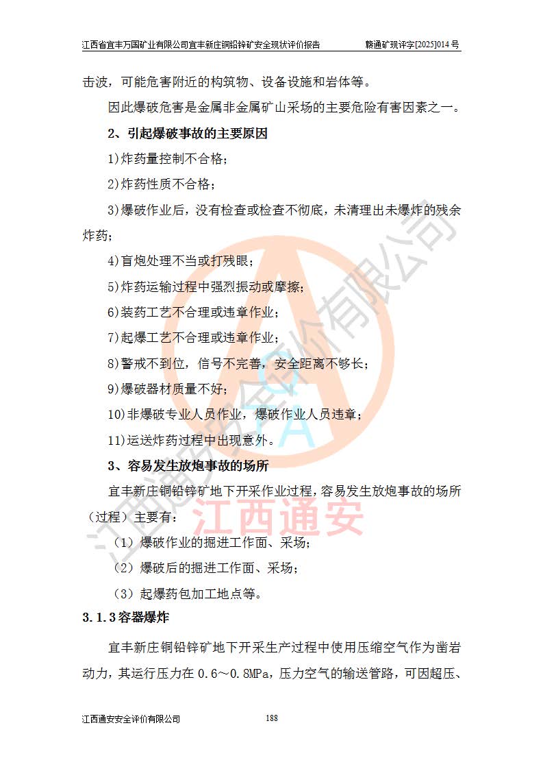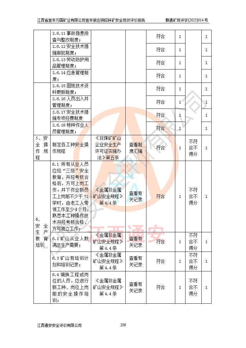 其它 | 江西省宜丰万国矿业有限公司宜丰新庄铜铅锌矿地下开采的主要生产及辅助系统:提升运输、排水、供配电、通风、供风、采掘、安全避险“六大系统”等符合法律法规要求和规程、规范要求;各种危险有害因素及不可接受的风险在运行中认真落实行之**的技术措施或管理措施,严格按规程,按要求加强管理,可以避免和控制各类事故,**安全生产。现阶段矿山设备、设施和场所符合**安全生产有关法律、法规、标准及规范的规定。矿山采用竖井开拓方式,安全生产条件较好;安全管理能满足法规要求,矿山现状与安全设施设计一致,矿山地下开采符合**规定的安全生产条件。 |