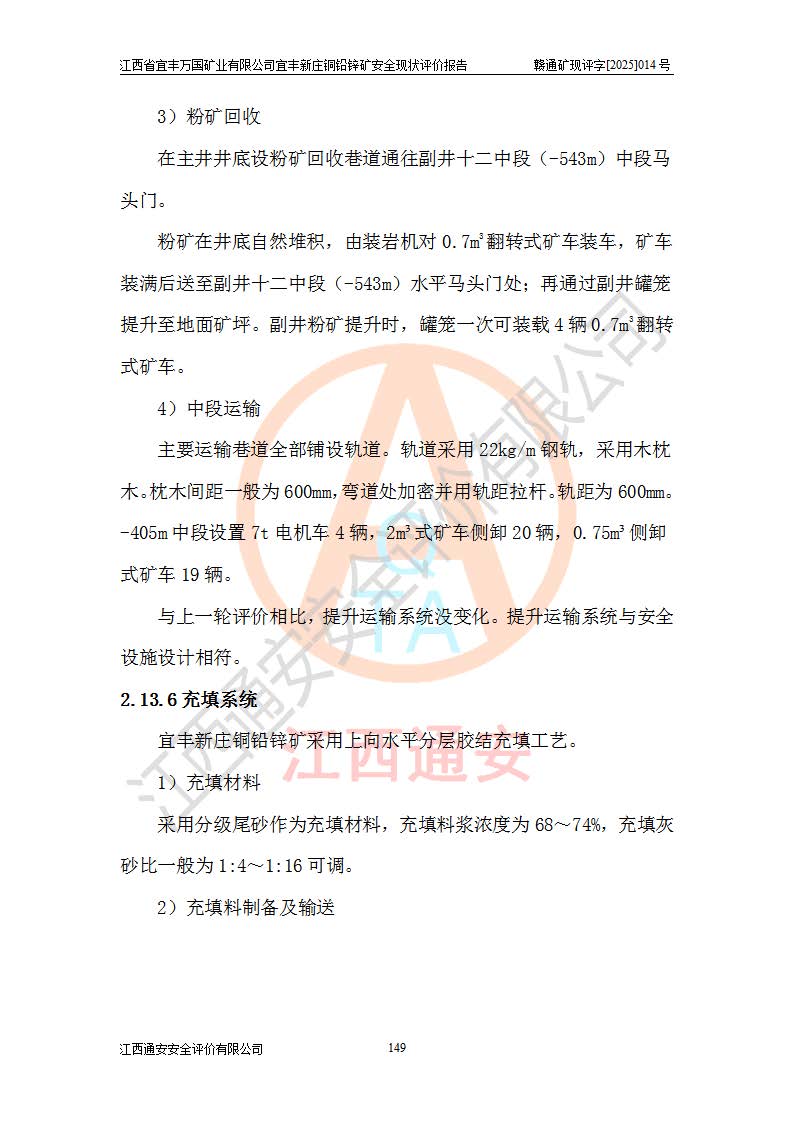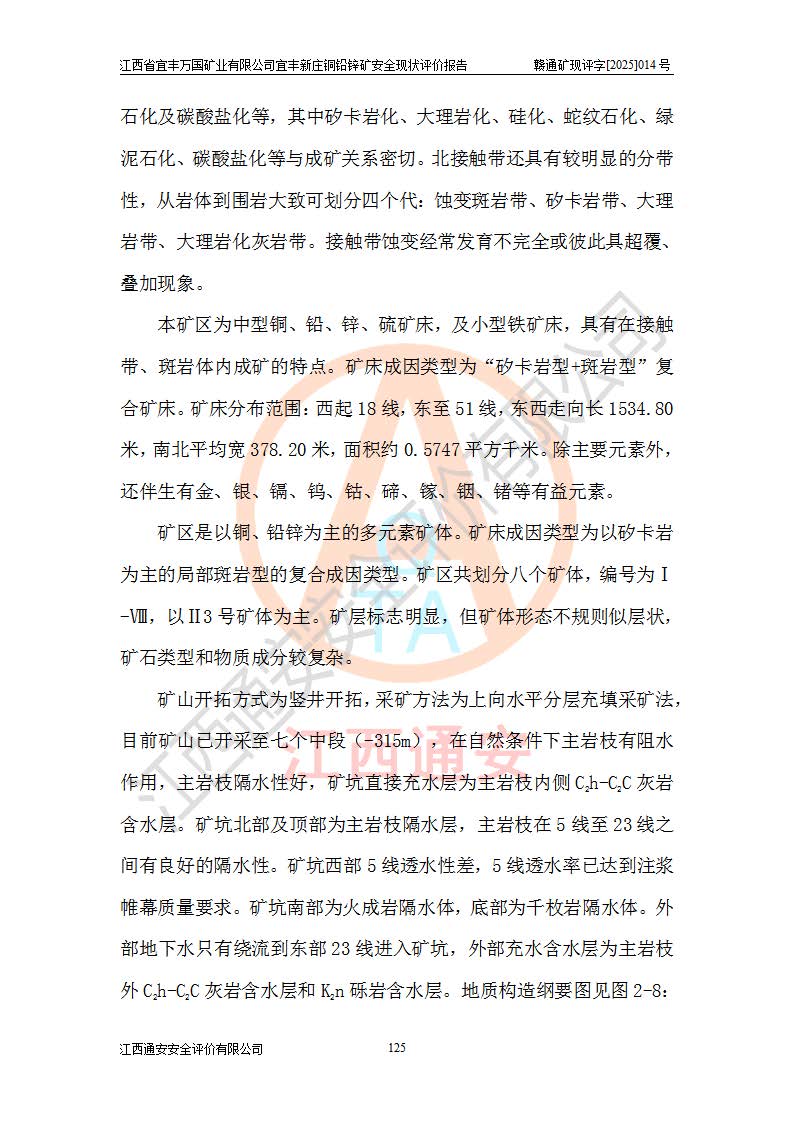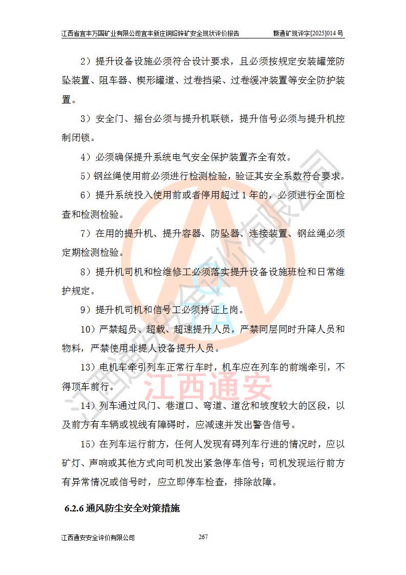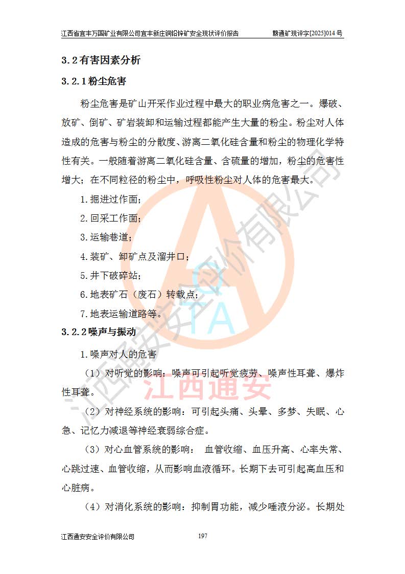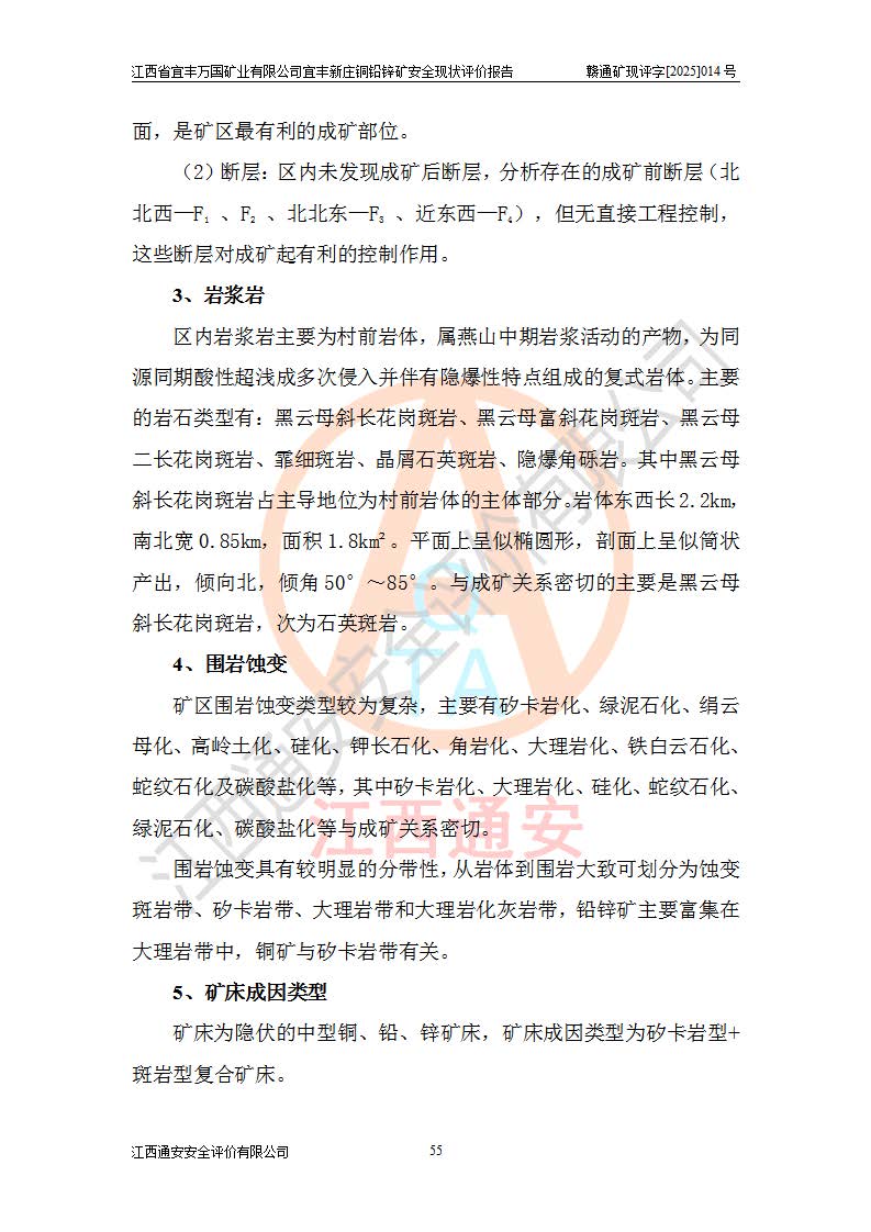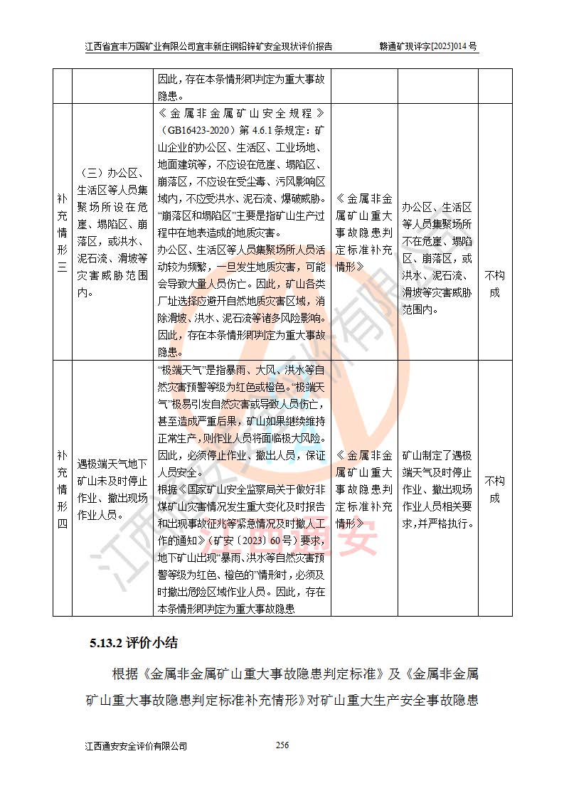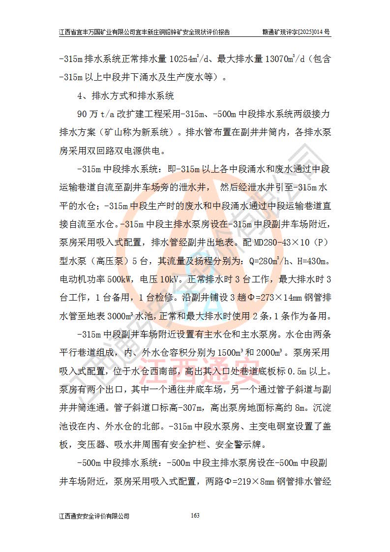其它 | 江西省宜丰万国矿业有限公司宜丰新庄铜铅锌矿地下开采的主要生产及辅助系统:提升运输、排水、供配电、通风、供风、采掘、安全避险“六大系统”等符合法律法规要求和规程、规范要求;各种危险有害因素及不可接受的风险在运行中认真落实行之**的技术措施或管理措施,严格按规程,按要求加强管理,可以避免和控制各类事故,**安全生产。现阶段矿山设备、设施和场所符合**安全生产有关法律、法规、标准及规范的规定。矿山采用竖井开拓方式,安全生产条件较好;安全管理能满足法规要求,矿山现状与安全设施设计一致,矿山地下开采符合**规定的安全生产条件。 |