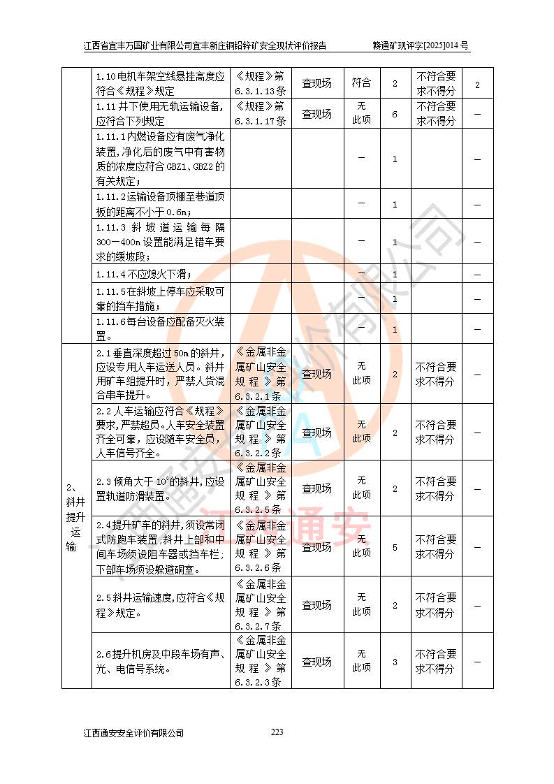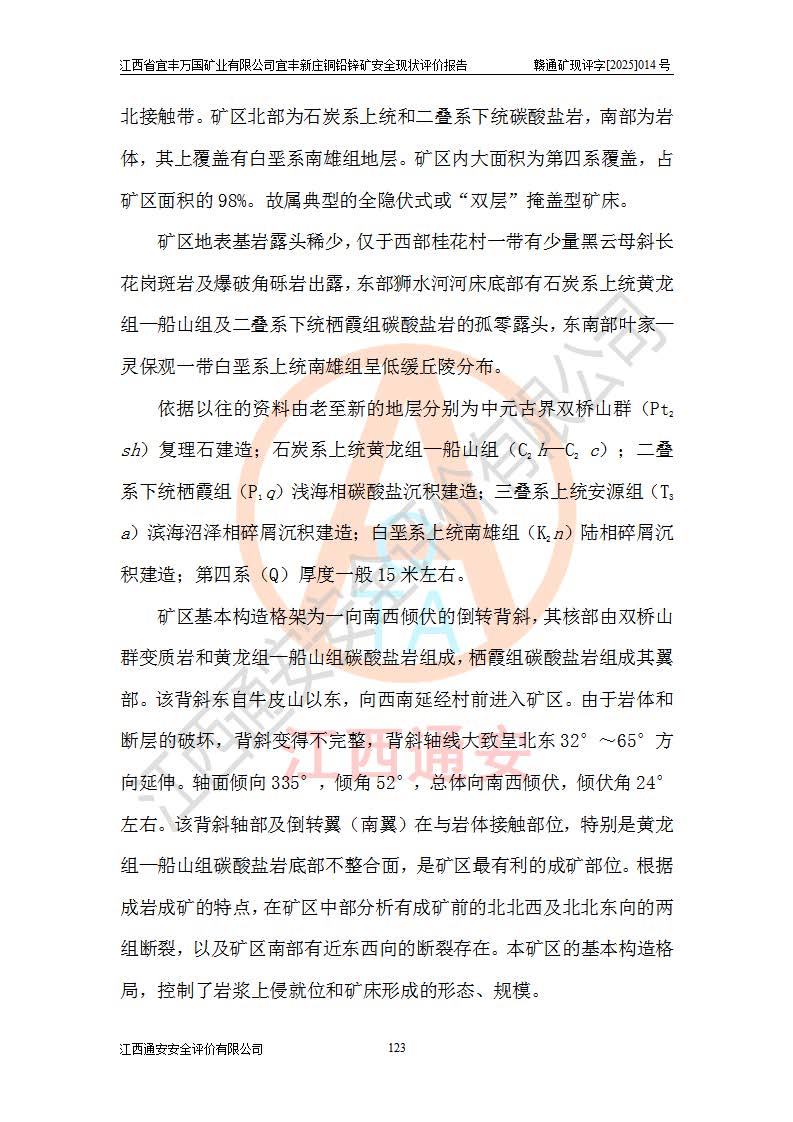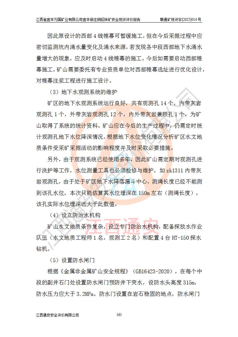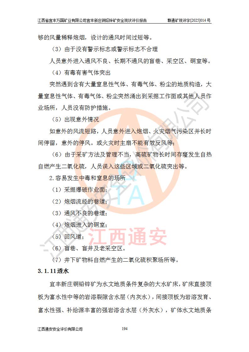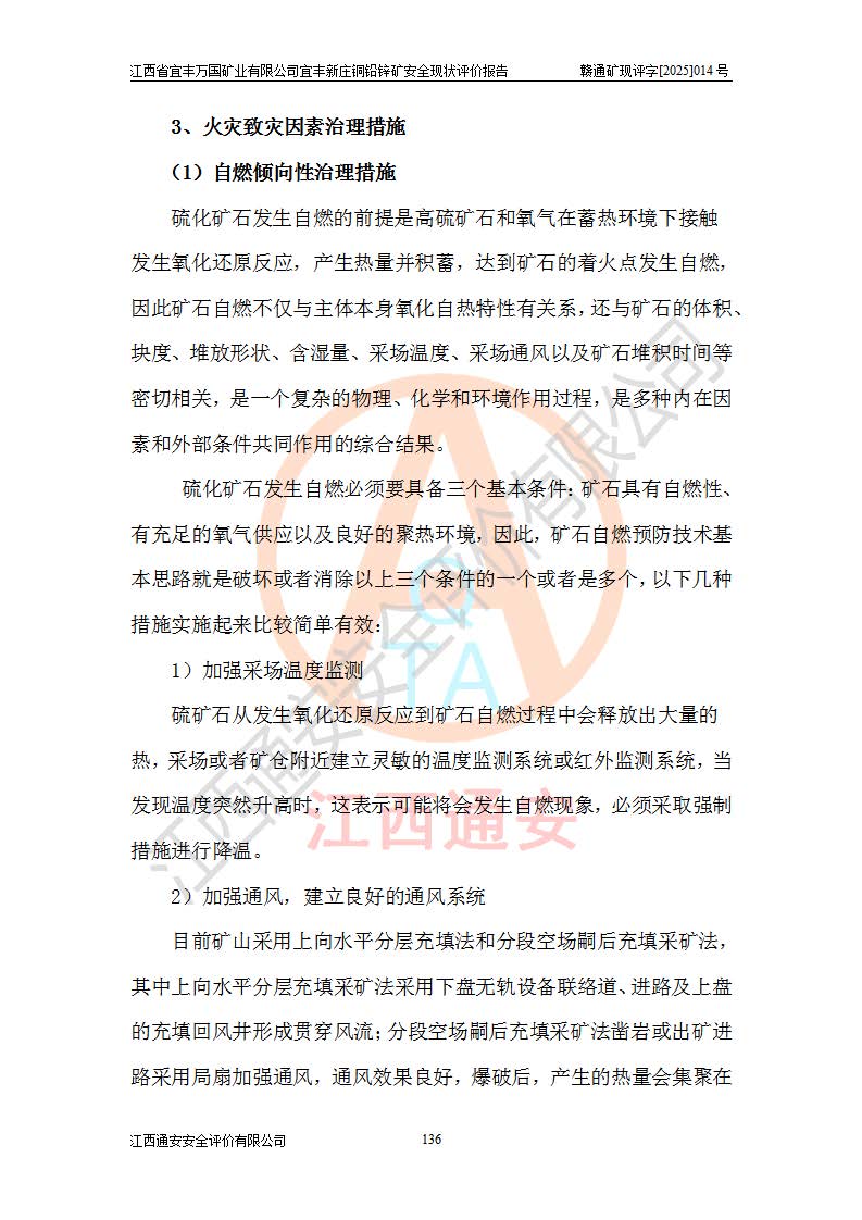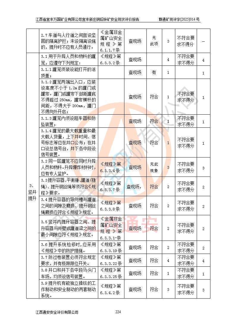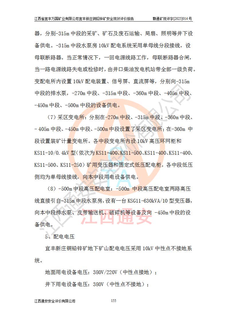 其它 | 江西省宜丰万国矿业有限公司宜丰新庄铜铅锌矿地下开采的主要生产及辅助系统:提升运输、排水、供配电、通风、供风、采掘、安全避险“六大系统”等符合法律法规要求和规程、规范要求;各种危险有害因素及不可接受的风险在运行中认真落实行之**的技术措施或管理措施,严格按规程,按要求加强管理,可以避免和控制各类事故,**安全生产。现阶段矿山设备、设施和场所符合**安全生产有关法律、法规、标准及规范的规定。矿山采用竖井开拓方式,安全生产条件较好;安全管理能满足法规要求,矿山现状与安全设施设计一致,矿山地下开采符合**规定的安全生产条件。 |