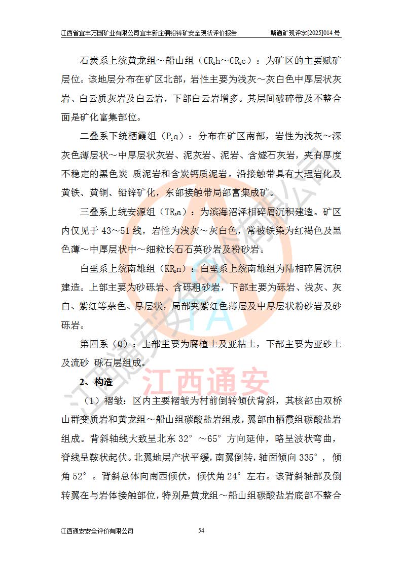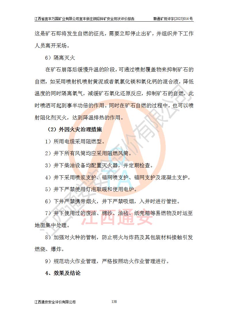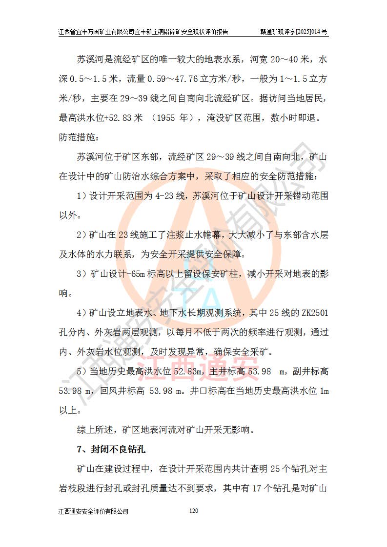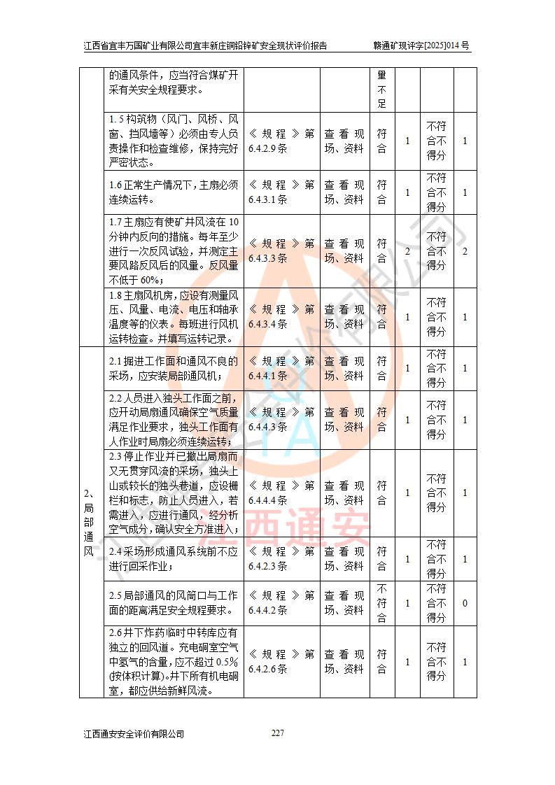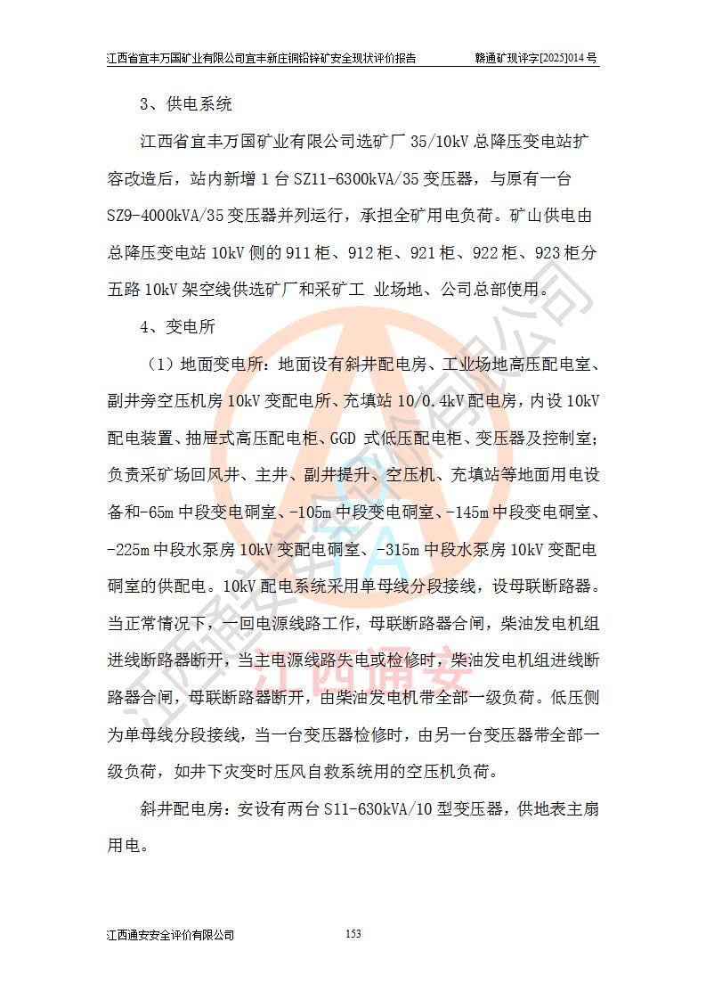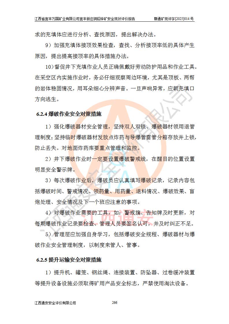 其它 | 江西省宜丰万国矿业有限公司宜丰新庄铜铅锌矿地下开采的主要生产及辅助系统:提升运输、排水、供配电、通风、供风、采掘、安全避险“六大系统”等符合法律法规要求和规程、规范要求;各种危险有害因素及不可接受的风险在运行中认真落实行之**的技术措施或管理措施,严格按规程,按要求加强管理,可以避免和控制各类事故,**安全生产。现阶段矿山设备、设施和场所符合**安全生产有关法律、法规、标准及规范的规定。矿山采用竖井开拓方式,安全生产条件较好;安全管理能满足法规要求,矿山现状与安全设施设计一致,矿山地下开采符合**规定的安全生产条件。 |