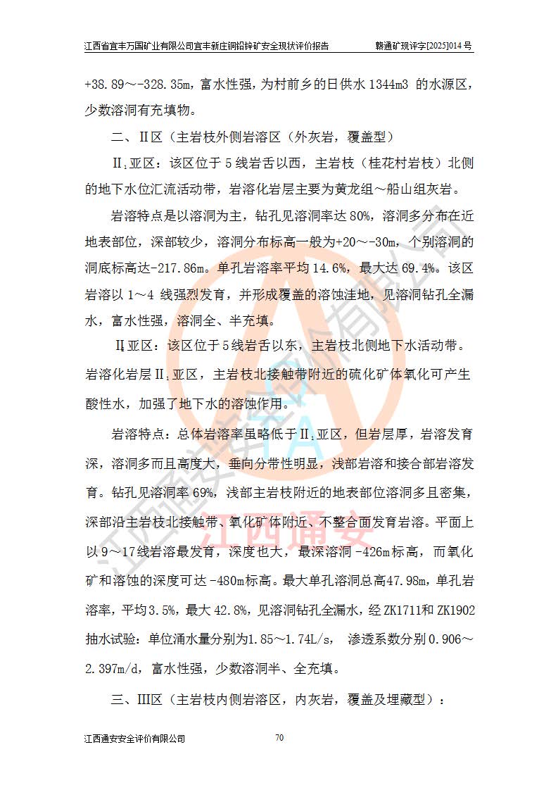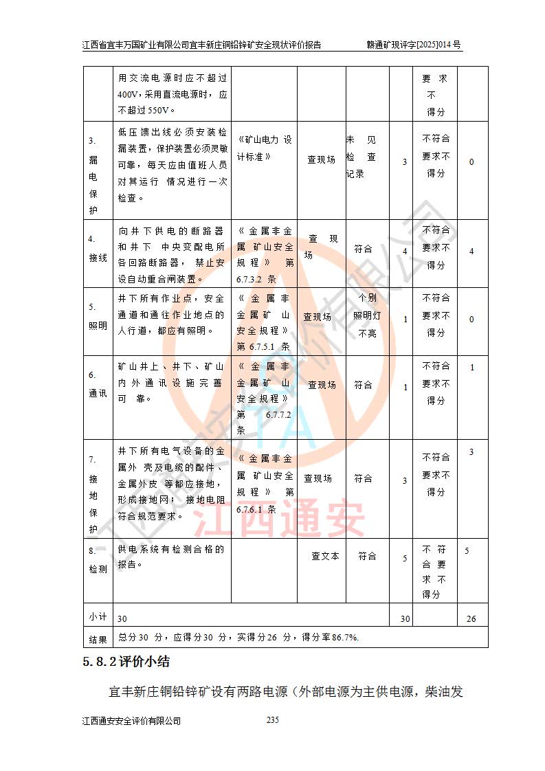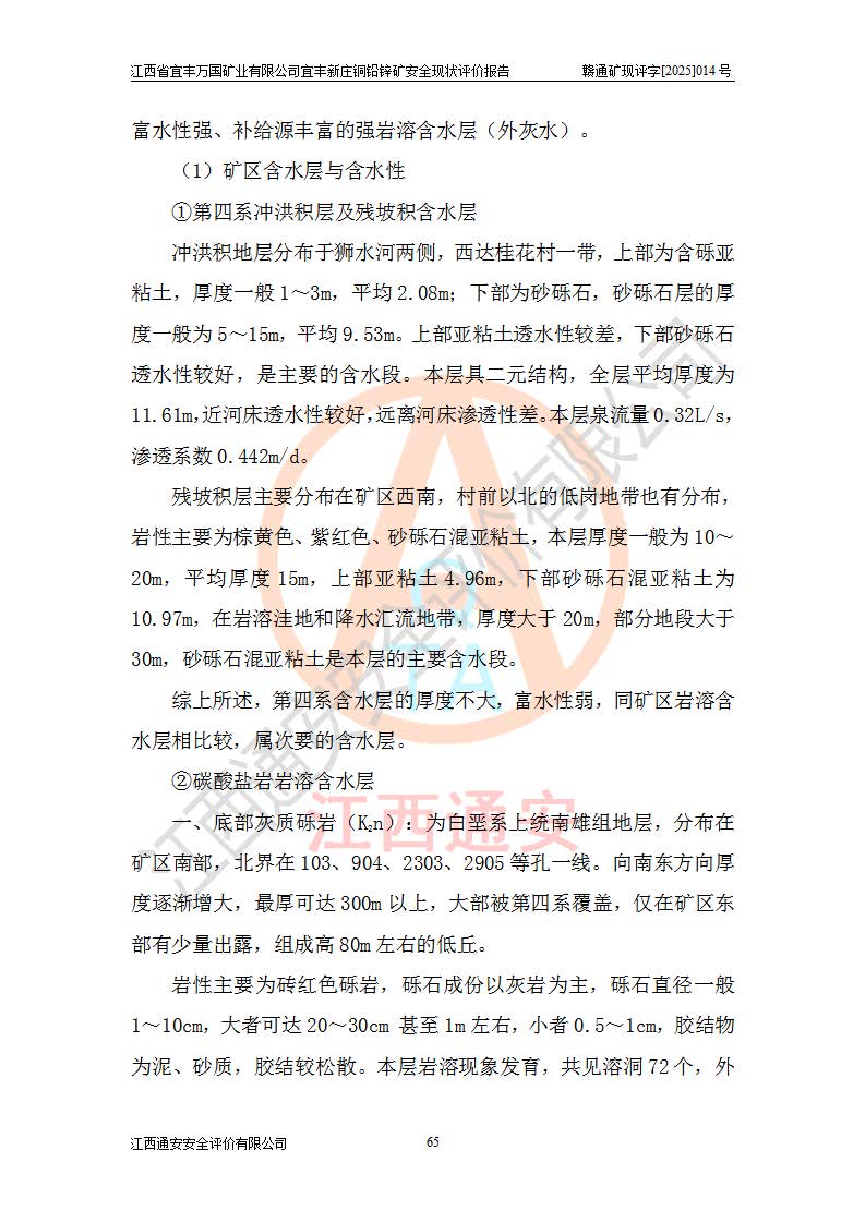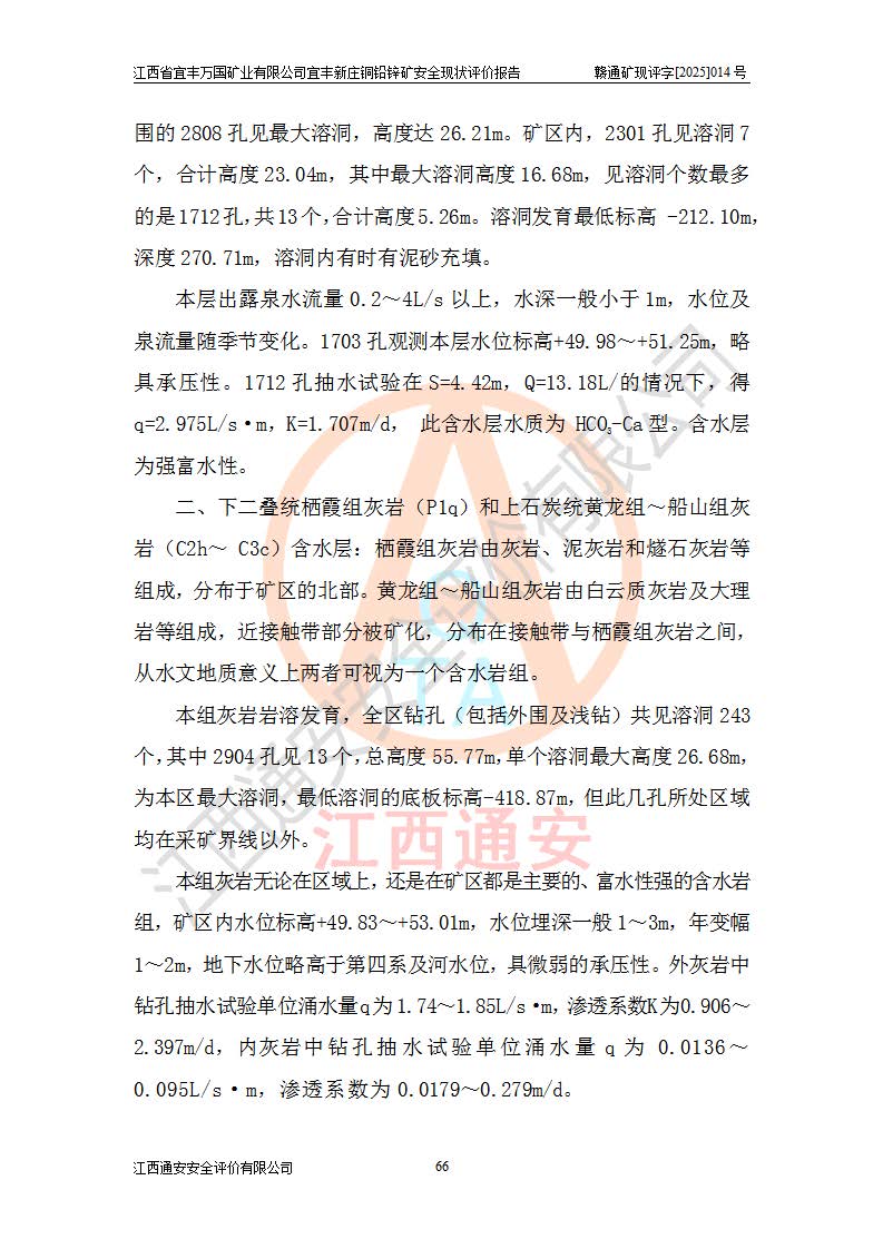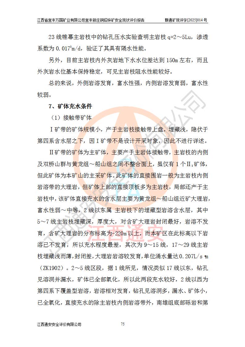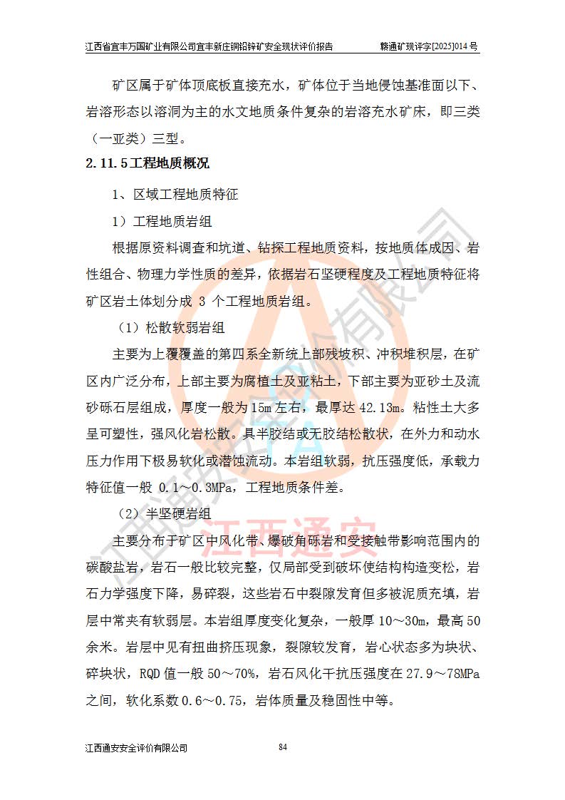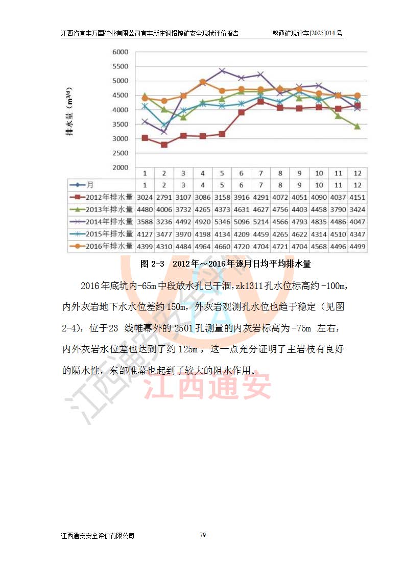 其它 | 江西省宜丰万国矿业有限公司宜丰新庄铜铅锌矿地下开采的主要生产及辅助系统:提升运输、排水、供配电、通风、供风、采掘、安全避险“六大系统”等符合法律法规要求和规程、规范要求;各种危险有害因素及不可接受的风险在运行中认真落实行之**的技术措施或管理措施,严格按规程,按要求加强管理,可以避免和控制各类事故,**安全生产。现阶段矿山设备、设施和场所符合**安全生产有关法律、法规、标准及规范的规定。矿山采用竖井开拓方式,安全生产条件较好;安全管理能满足法规要求,矿山现状与安全设施设计一致,矿山地下开采符合**规定的安全生产条件。 |