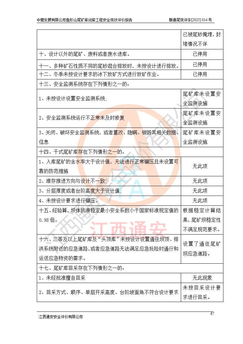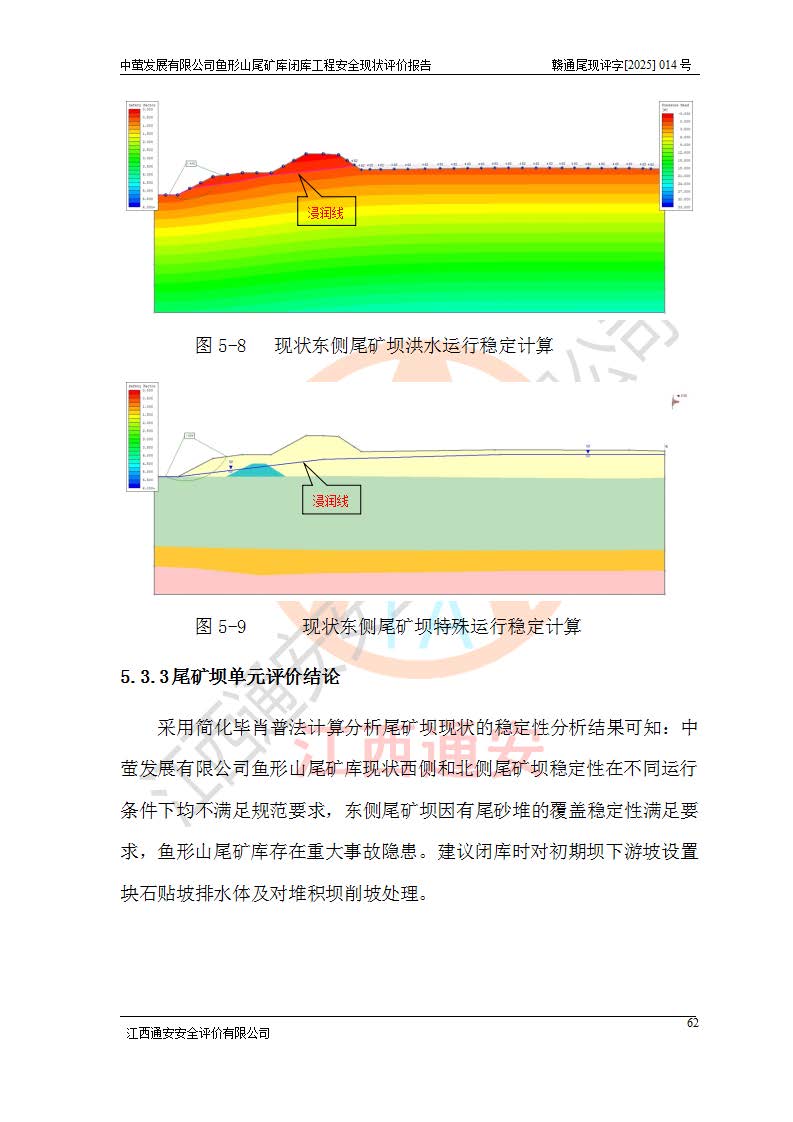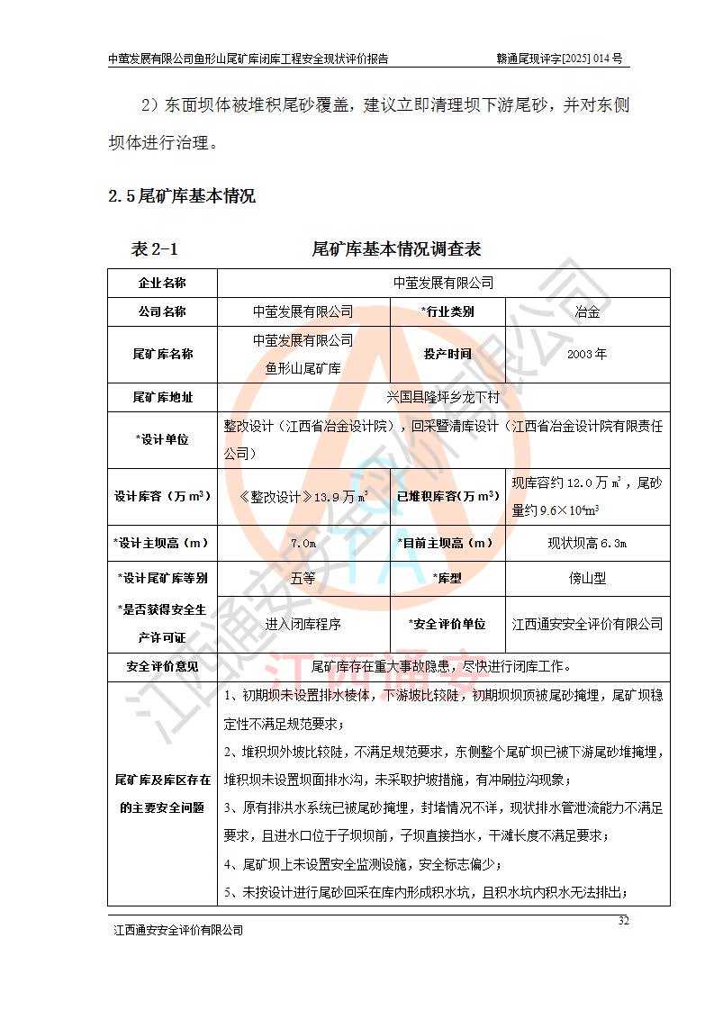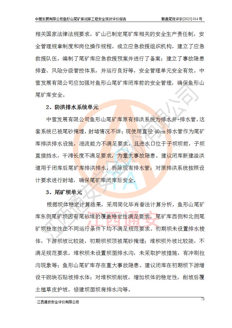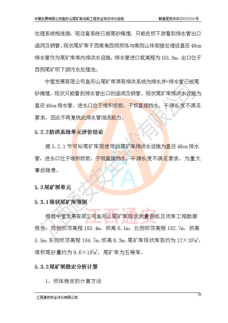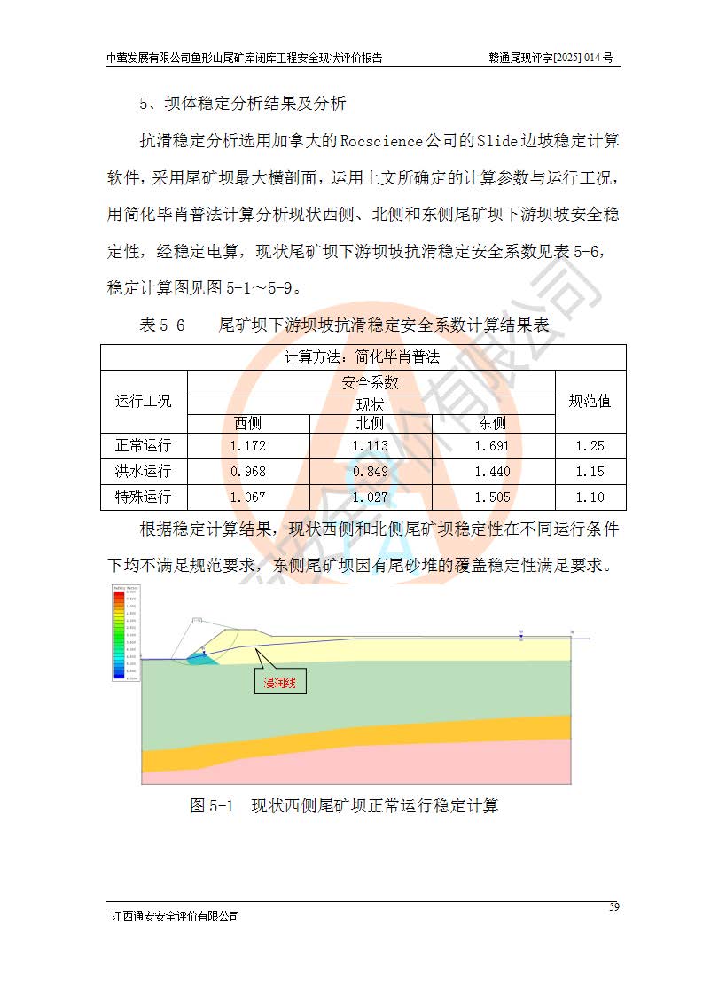 存在的问题: 1、初期坝未设置排水棱体,下游坡比较陡,初期坝坝顶被尾砂掩埋,尾矿坝稳定性不满足规范要求; 2、堆积坝外坡比较陡,不满足规范要求,东侧整个尾矿坝已被下游尾砂堆掩埋,堆积坝未设置坝面排水沟,未采取护坡措施,有冲刷拉沟现象; 3、原有排洪水系统已被尾砂掩埋,封堵情况不详,现状排水管泄流能力不满足要求,且进水口位于子坝坝前,子坝直接挡水,干滩长度不满足要求; 4、尾矿坝上未设置安全监测设施,安全标志偏少; 5、未按设计进行尾砂回采,在库内形成积水坑,且积水坑内积水无法排出; 6、尾矿库不再进行尾砂回采,也不再使用,应进行闭库。 整改措施: 1、在初期坝下游增设干砌块石贴坡排水体,增加坝体稳定性,在北侧和东侧初期坝坝脚增设坝脚排水沟。 2、对堆积坝削坡,增加坝体的稳定性,削坡后覆土植草皮护坡,修建坝面坝肩排水沟。 3、新建溢洪道用于闭库后尾矿库排洪排水,拆除现有排水管;对原排洪系统进行封堵。 4、闭库时在尾矿坝上增设安全监测设施,增设安全标志。 5、对库内积水坑进行平整。 6、应进行闭库,整治尾矿库库内干滩面,为防止干滩面水土流失,覆土植草,覆土范围为整个库区范围。在库内干滩面设置库面排水沟,截洪沟、新建溢洪道,形成库内排水网,能**的将库内雨水排至库外。 |