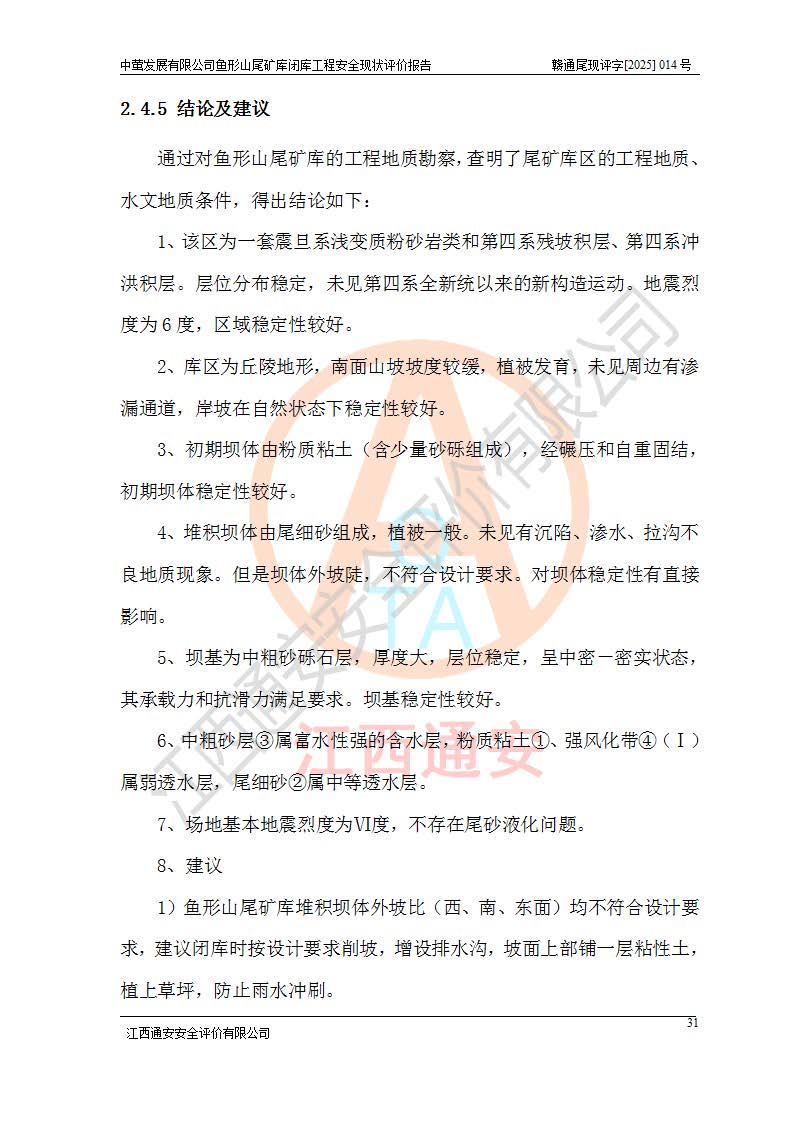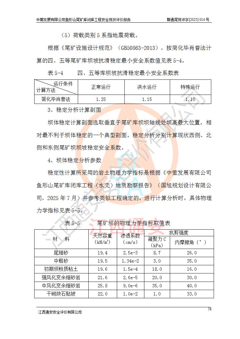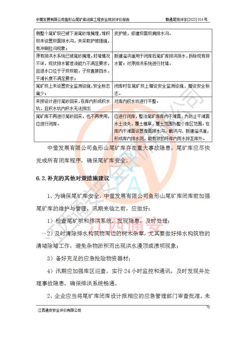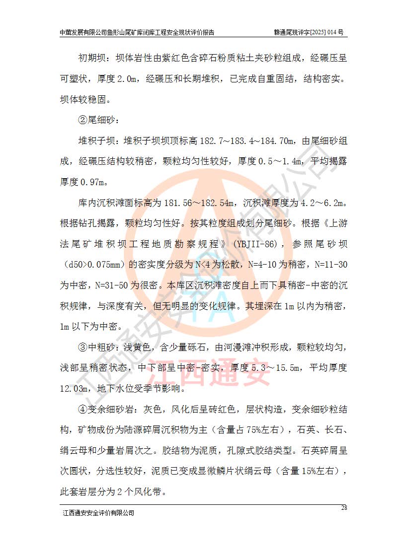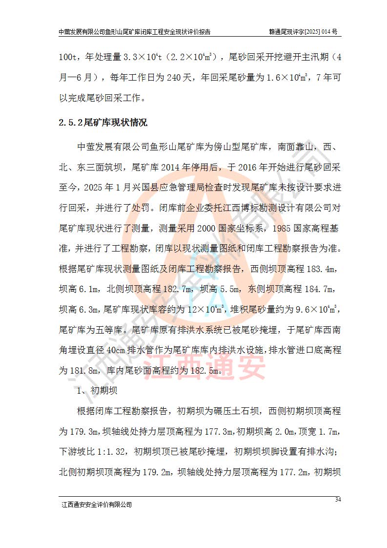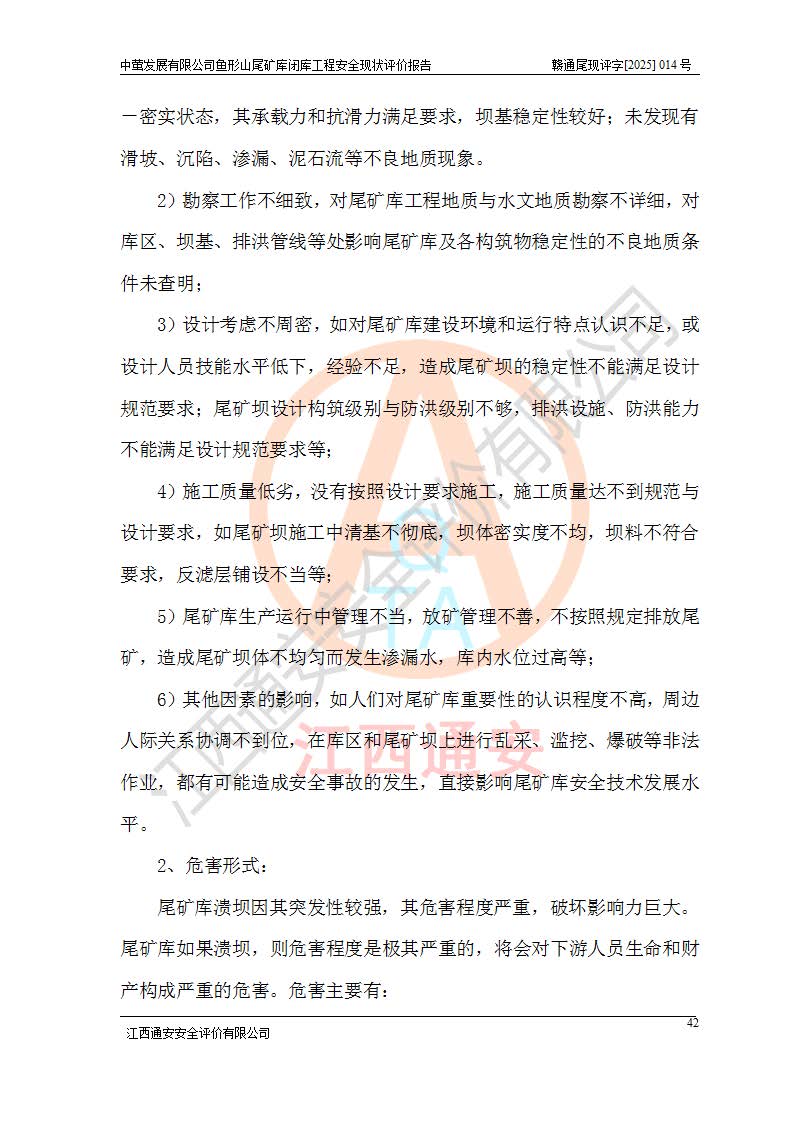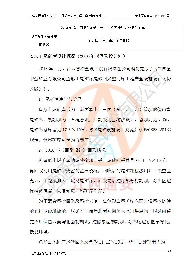 存在的问题: 1、初期坝未设置排水棱体,下游坡比较陡,初期坝坝顶被尾砂掩埋,尾矿坝稳定性不满足规范要求; 2、堆积坝外坡比较陡,不满足规范要求,东侧整个尾矿坝已被下游尾砂堆掩埋,堆积坝未设置坝面排水沟,未采取护坡措施,有冲刷拉沟现象; 3、原有排洪水系统已被尾砂掩埋,封堵情况不详,现状排水管泄流能力不满足要求,且进水口位于子坝坝前,子坝直接挡水,干滩长度不满足要求; 4、尾矿坝上未设置安全监测设施,安全标志偏少; 5、未按设计进行尾砂回采,在库内形成积水坑,且积水坑内积水无法排出; 6、尾矿库不再进行尾砂回采,也不再使用,应进行闭库。 整改措施: 1、在初期坝下游增设干砌块石贴坡排水体,增加坝体稳定性,在北侧和东侧初期坝坝脚增设坝脚排水沟。 2、对堆积坝削坡,增加坝体的稳定性,削坡后覆土植草皮护坡,修建坝面坝肩排水沟。 3、新建溢洪道用于闭库后尾矿库排洪排水,拆除现有排水管;对原排洪系统进行封堵。 4、闭库时在尾矿坝上增设安全监测设施,增设安全标志。 5、对库内积水坑进行平整。 6、应进行闭库,整治尾矿库库内干滩面,为防止干滩面水土流失,覆土植草,覆土范围为整个库区范围。在库内干滩面设置库面排水沟,截洪沟、新建溢洪道,形成库内排水网,能**的将库内雨水排至库外。 |
