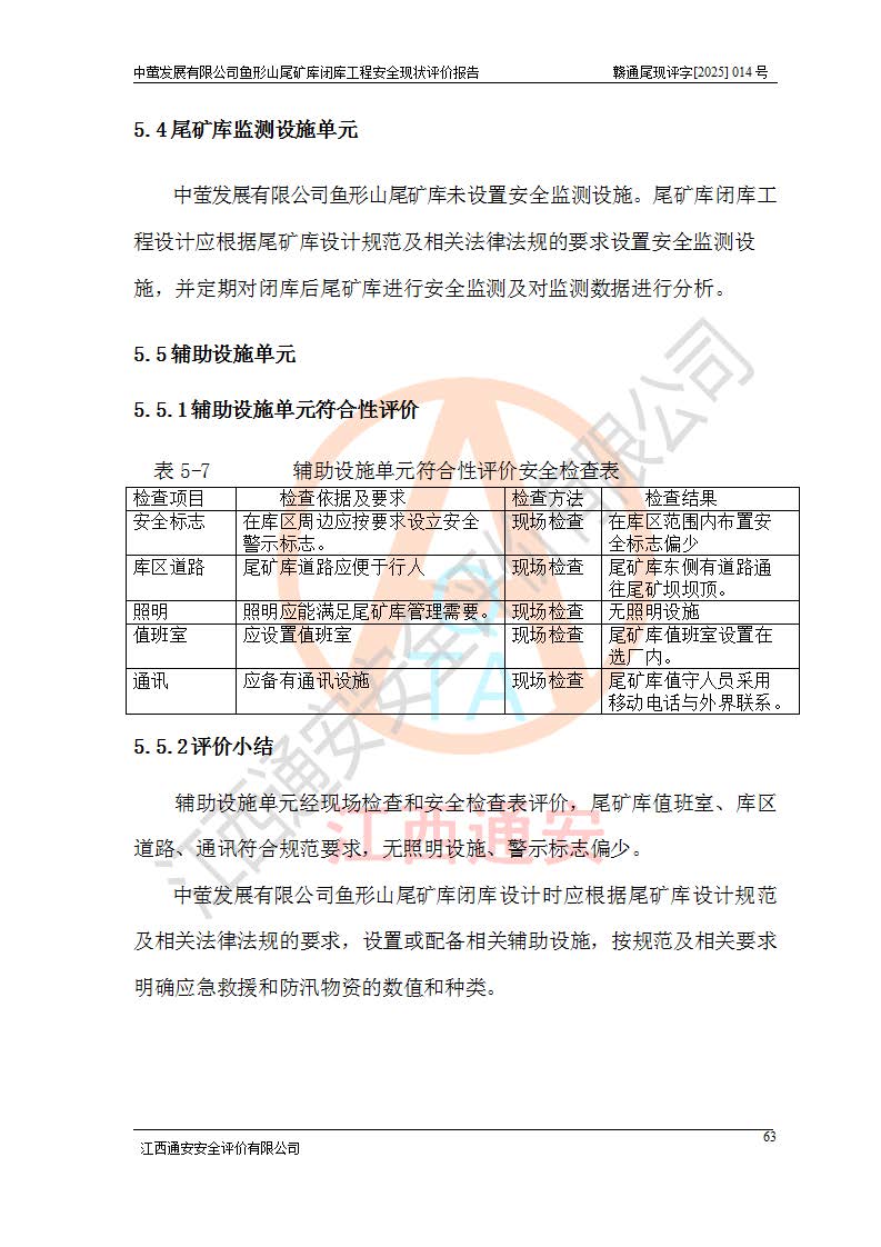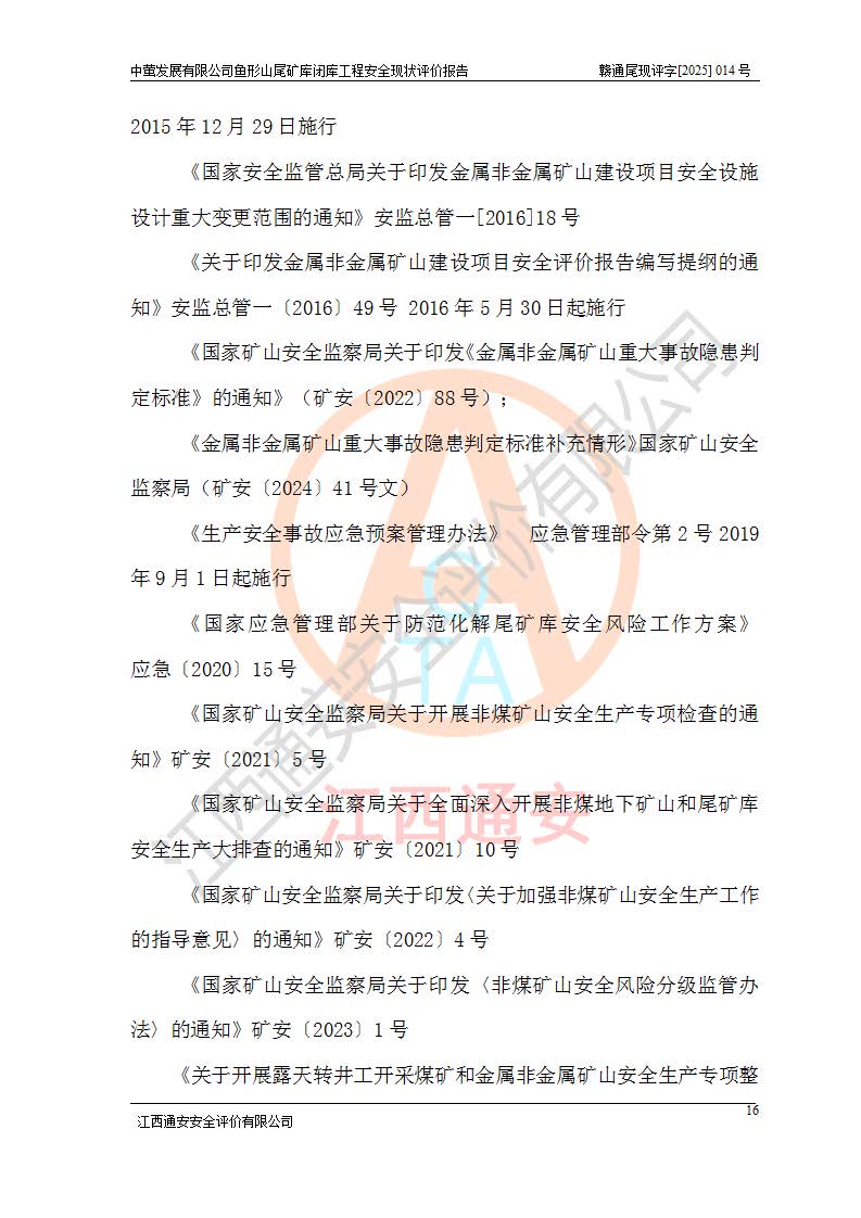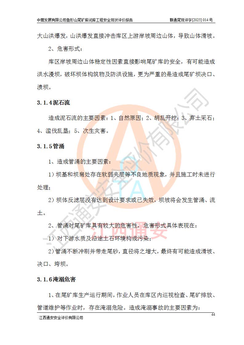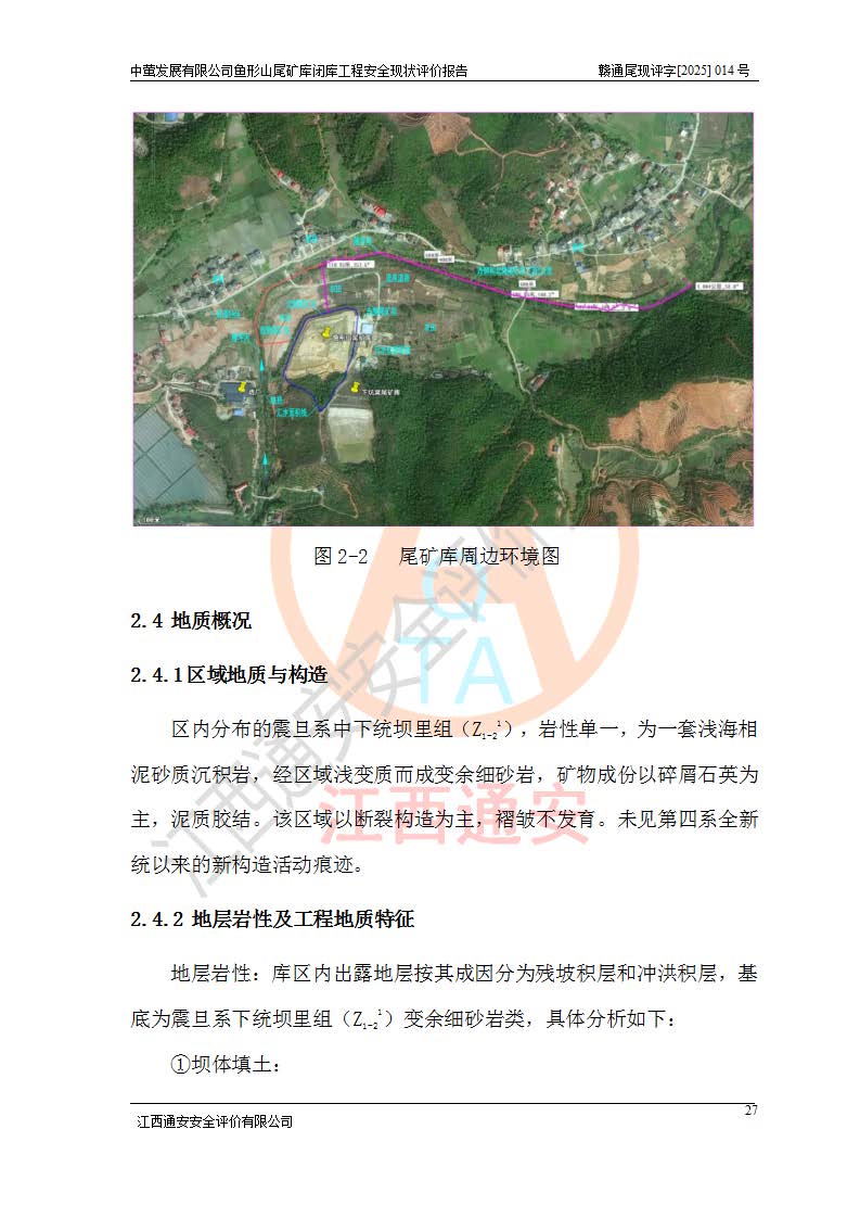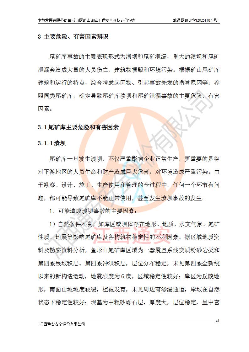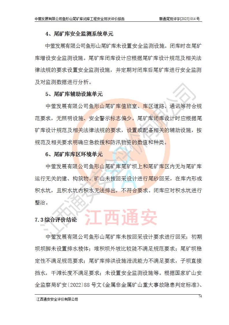 存在的问题: 1、初期坝未设置排水棱体,下游坡比较陡,初期坝坝顶被尾砂掩埋,尾矿坝稳定性不满足规范要求; 2、堆积坝外坡比较陡,不满足规范要求,东侧整个尾矿坝已被下游尾砂堆掩埋,堆积坝未设置坝面排水沟,未采取护坡措施,有冲刷拉沟现象; 3、原有排洪水系统已被尾砂掩埋,封堵情况不详,现状排水管泄流能力不满足要求,且进水口位于子坝坝前,子坝直接挡水,干滩长度不满足要求; 4、尾矿坝上未设置安全监测设施,安全标志偏少; 5、未按设计进行尾砂回采,在库内形成积水坑,且积水坑内积水无法排出; 6、尾矿库不再进行尾砂回采,也不再使用,应进行闭库。 整改措施: 1、在初期坝下游增设干砌块石贴坡排水体,增加坝体稳定性,在北侧和东侧初期坝坝脚增设坝脚排水沟。 2、对堆积坝削坡,增加坝体的稳定性,削坡后覆土植草皮护坡,修建坝面坝肩排水沟。 3、新建溢洪道用于闭库后尾矿库排洪排水,拆除现有排水管;对原排洪系统进行封堵。 4、闭库时在尾矿坝上增设安全监测设施,增设安全标志。 5、对库内积水坑进行平整。 6、应进行闭库,整治尾矿库库内干滩面,为防止干滩面水土流失,覆土植草,覆土范围为整个库区范围。在库内干滩面设置库面排水沟,截洪沟、新建溢洪道,形成库内排水网,能**的将库内雨水排至库外。 |